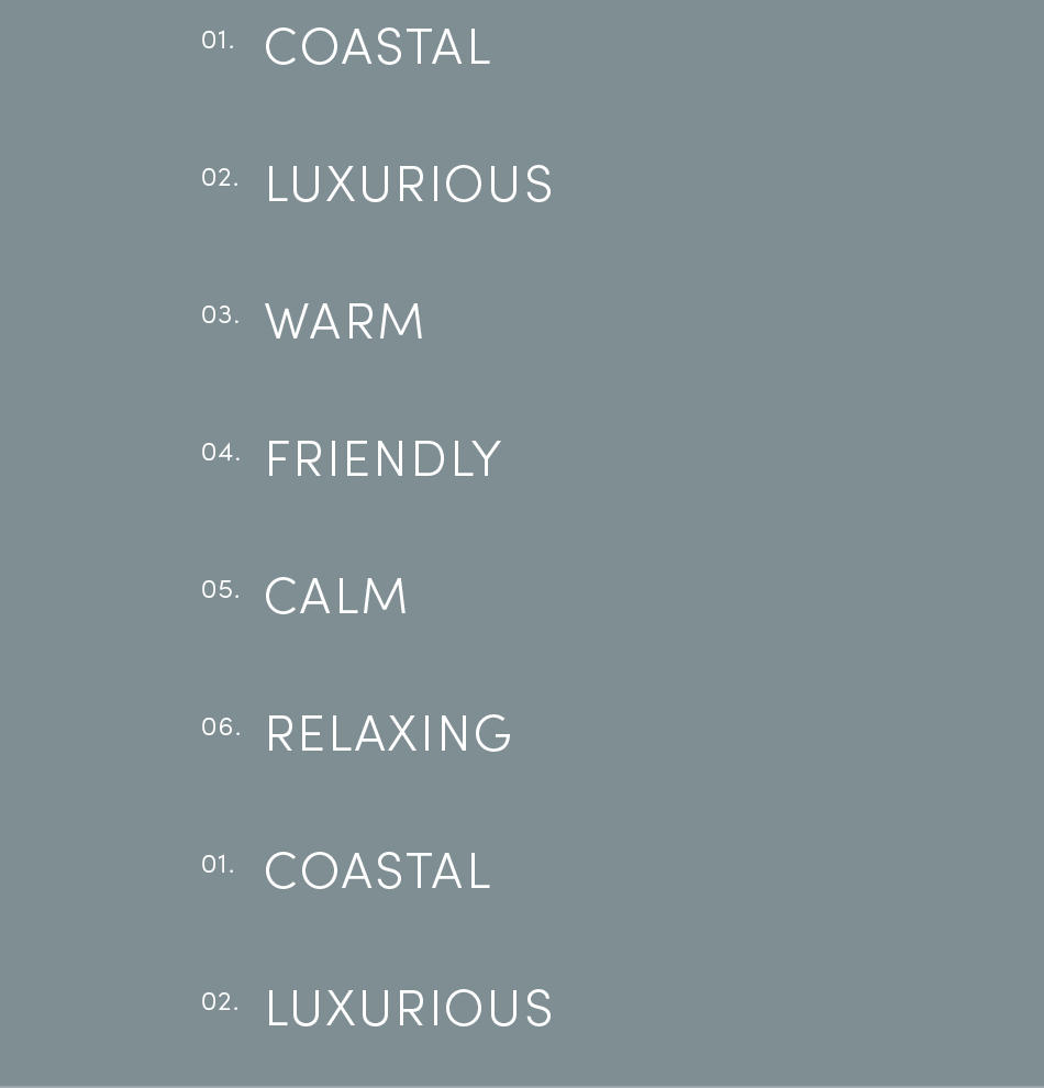 coastal, luxurious, warm, friendly, calm, relaxing